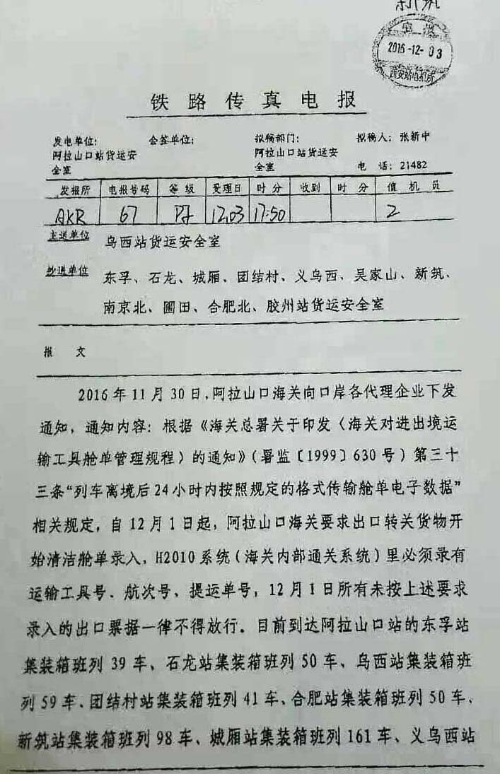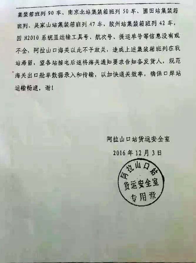而各地陸續(xù)發(fā)運(yùn)的鐵路班列,為保證運(yùn)輸效率,發(fā)運(yùn)地采用先報(bào)關(guān)后裝車方式,造成轉(zhuǎn)關(guān)單不符合口岸海關(guān)要求,因此導(dǎo)致阿拉山口口岸貨物大量滯留,截至發(fā)稿已逾1000車,只能采用人工補(bǔ)錄放行的處理方式,擁堵或?qū)⒊掷m(xù)較長(zhǎng)時(shí)間。