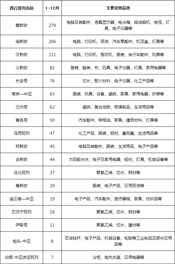 2016年途經(jīng)阿拉山口口岸的西行班列統(tǒng)計(jì)表